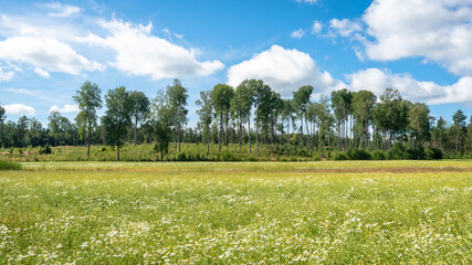 Beautiful smooth row of green trees at sunny summer day. There are trees at the edge of the field against blue sky background. Green plants frame large agricultural fields. Tree crowns, foliage leaves