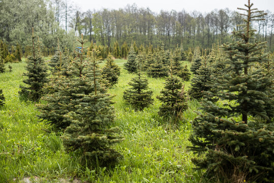 Plantatnion of young green fir Christmas trees, nordmann fir and another fir plants cultivation, ready for sale for Christmas and New year celebratoin in winter