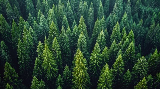 Lush evergreen forest viewed from above, showcasing dense pine trees in vibrant green hues during daylight