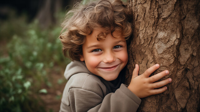 Smiling boy hugging a tree
