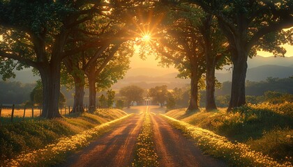 Sunlit path through a tree lined avenue