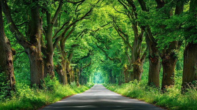 Scenic treelined avenue creating a natural green tunnel on a sunny day.