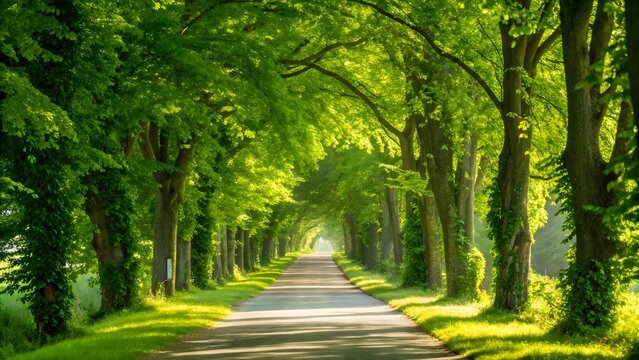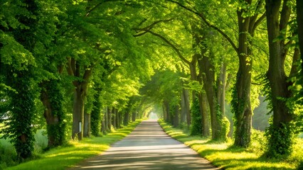 low angle empty city avenue of smooth asphalt leading to towering glass skyscrapers framed by lush green trees at sunrise, calm peaceful morning