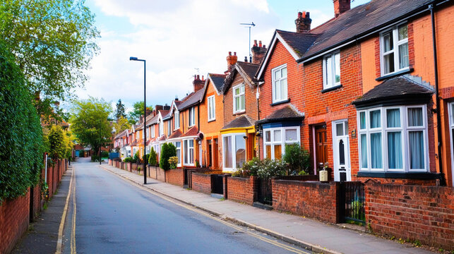 A street lined with colorful houses and trees, with a clear blue sky overhead.
