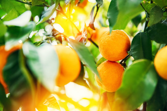 Blood orange fruit (sanguinelli) growing on a tree, fresh, organic - closeup image
