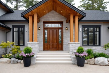 Contemporary garden design featuring rusted corten steel planters with ornamental grasses, pebble mulch, and olive trees, creating a modern, tranquil outdoor space