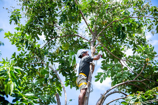 Asian worker is Wear protective equipment from falling from heights and climbing trees for trim branches in a park.