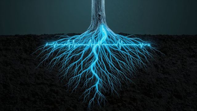 Glowing blue roots spreading beneath tree trunk dark soil cross-section concept