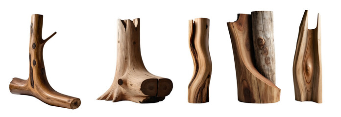 Set of modern decorative natural wood tree sculptures isolated on transparent background. Generative AI