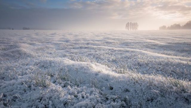 Frost-covered meadow bathing in dawn mist with crystalline hoarfrost and lone tree silhouette