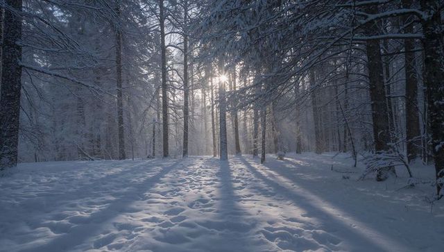 Sunburst shining through snowy fir trees casting long shadows across alpine clearing