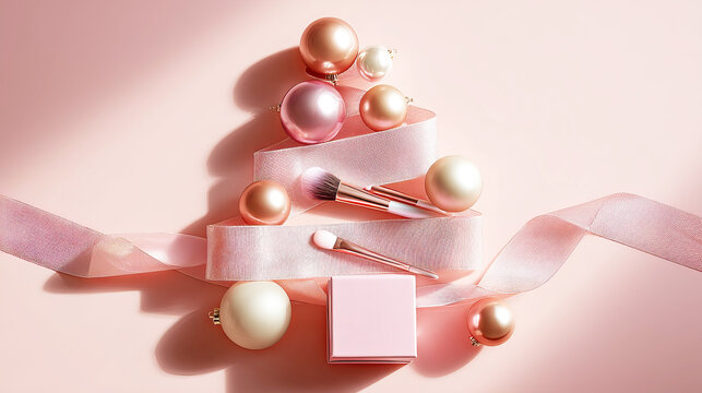 Arranging festive baubles into christmas tree shape on white backdrop with gold stars