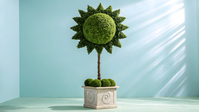 Sun shaped green topiary tree in decorative stone pot under soft sunlight on pastel blue background, artistic design concept