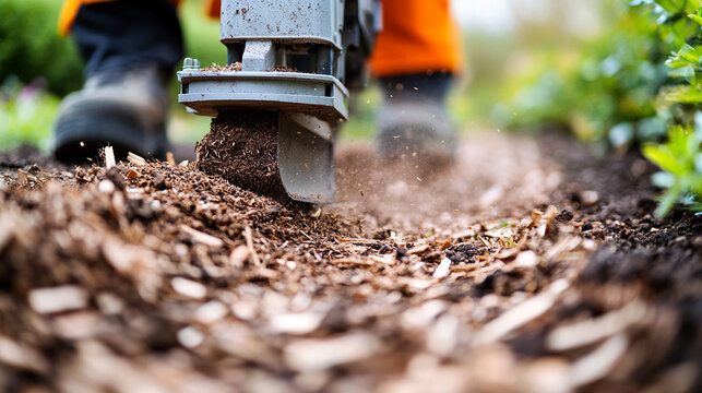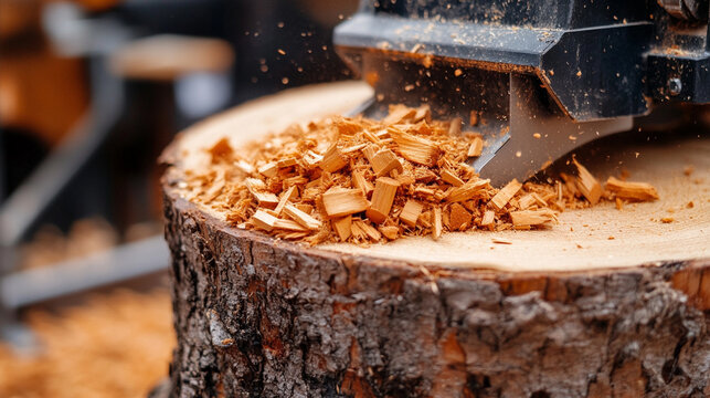 A stump grinder machine grinds a tree stump in a garden, creating wood chips. The process symbolizes renewal, land restoration, and clearing space for new growth. Selective focus, modern
