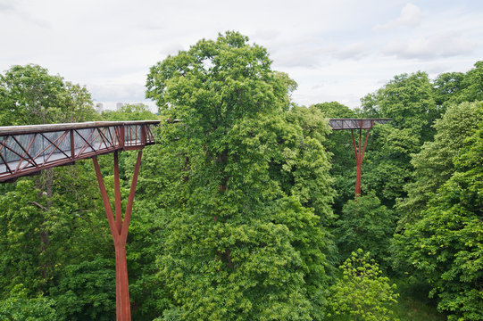 Trees in the forest, bottom view, birch and poplar with thin trunks and green foliage, tree tops against the sky. Forest landscape.