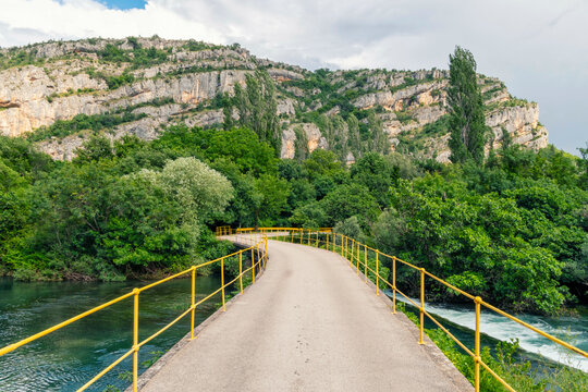 Yellow railed bridge over a river with lush greenery and towering cliffs in the background under a cloudy sky, Krka national park