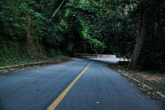 Serene road through dense forest with double yellow lines