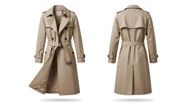 Blank beige trench coat template. Long trench coat with a belt and timeless silhouette. Transparent background.