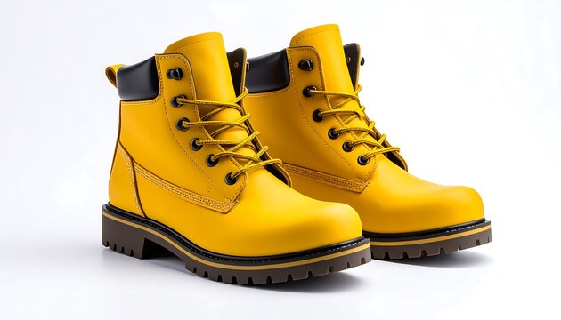 Pair of vibrant yellow leather work boots isolated on a pristine white backdrop showing the detail