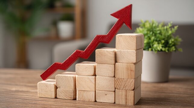 Three-dimensional graph symbolizing growth in business performance, displaying an upward trend against a blurred city backdrop with people walking in the background