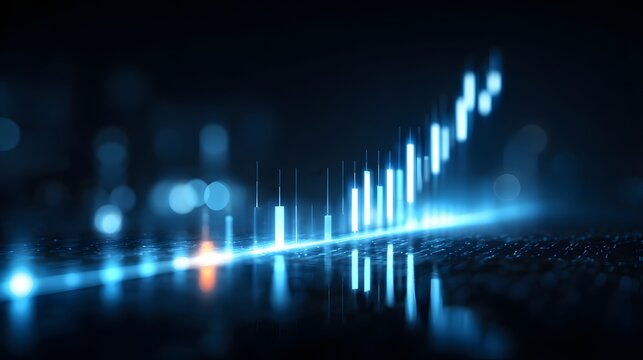 Neon candlestick chart visualizing market trend on digital finance dashboard with icons