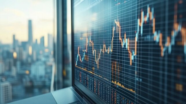Close-up of a digital screen displaying financial stock market data with graphs and analytics, illustrating market trends and investment analysis.