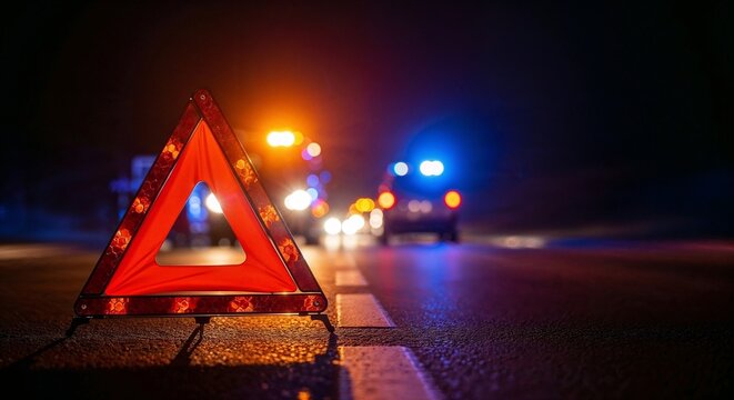 Emergency Beacon: A vivid red warning triangle glows ominously in the dim night, an immediate signal of hazard on a darkened road.