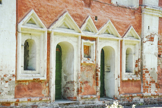 facade of an old, weathered building with a distinctive architectural style. a series of arched openings with triangular pediments above them. Semi ruined historic building. Russia, Yaroslavl