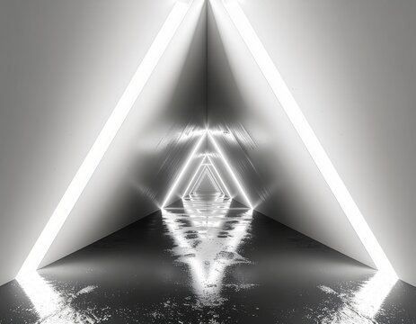 A futuristic, abstract tunnel with repeating illuminated triangular arches and a reflective floor, creating an infinite perspective.