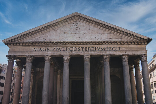 Low angle view of the pantheon's facade in rome, italy, showcasing classical architecture with corinthian columns, a triangular pediment, and the inscription under a vibrant blue sky