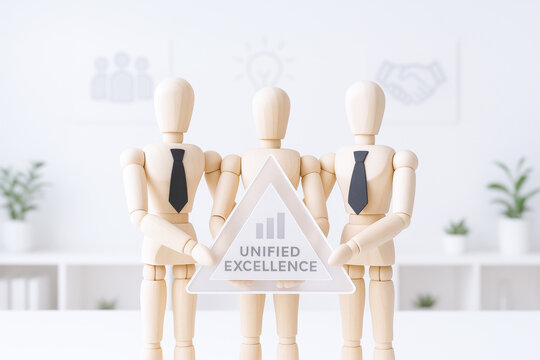 Three wooden mannequins dressed business attire holding triangular sign with words Unified Excellence and bar chart symbol, symbolizing teamwork
