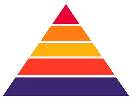 A layered, multicolored pyramid rises from a wide base to a single point. Each layer differs in shade, from red to violet