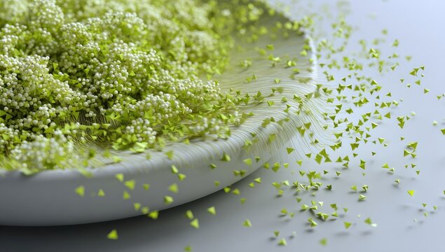 Abstract floral scene with particles.  A light beige dish holds a cluster of tiny, light green plants.  Yellow-green triangular particles are dispersing from the dish