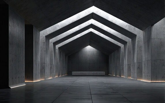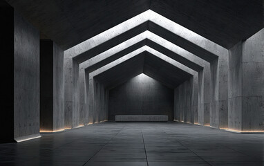 Futuristic neon tunnel with triangular beams and reflections
