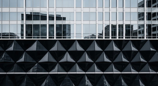 Abstract image of modern building facade, featuring glass panels reflecting cityscape, contrasted by geometric dark triangular pattern below, showcasing architectural design and urban reflection