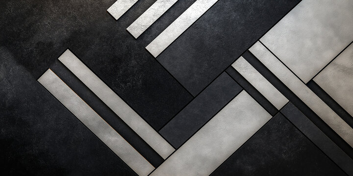 An abstract background in black, white, light gray, and silver, featuring geometric shapes with angular lines, striped corners, and folded triangular facets