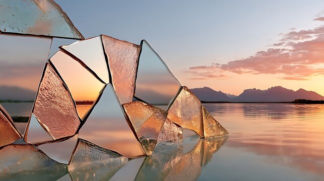 the photograph features a collection of triangular shaped glass pieces arranged together in a partial geometric structure that appears to be partially submerged in the water