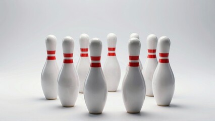 White bowling pins with red stripes in triangular formation