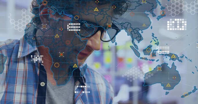 Mature man black-framed glasses blue plaid shirt gray tee studying data with map overlay at office