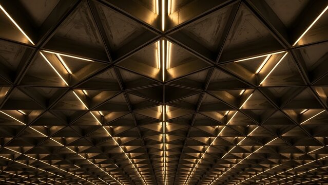 A grid of triangular glass panels creates a modern facade, reflecting nearby buildings. Contemporary designed mirrored surfaces capture urban architecture with geometric precision.