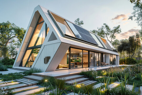 Modern residential suburban building A-frame architecture, a luminous triangular house with large windows at evening