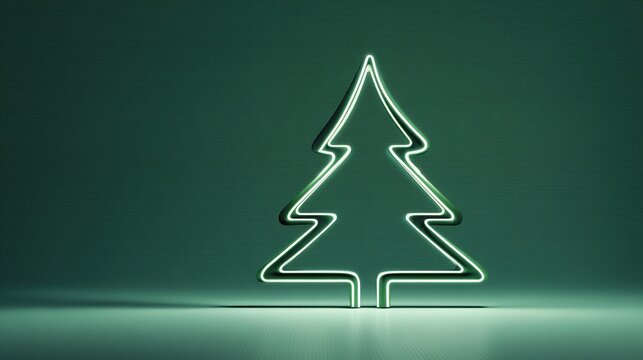 Neon green Christmas tree outline with bright glowing lines and triangular shape against deep textured green background, modern festive decor with reflective ground shadow