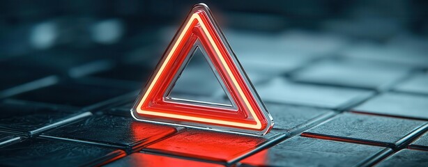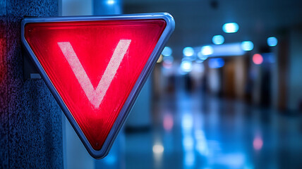 glowing red triangular warning sign with white V is mounted on wall in dimly lit corridor, creating sense of alertness and caution in workplace environment