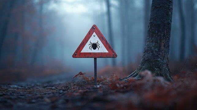 A triangular warning sign featuring a black deer tick hangs from a tree along a misty forest trail, surrounded by autumn leaves and a serene, isolated background