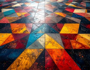 Golden triangular geometric mosaic arrangement with textured surfaces and warm lighting