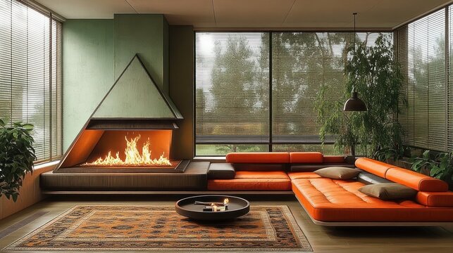 Modern living room with large orange sectional sofa, triangular open fireplace with burning fire, large windows with blinds showing outdoor trees, and green plants