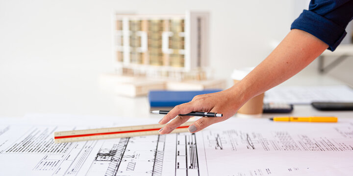 Close up hand of Architect or engineer professional. blueprint , structural floor plans with a pencil, triangular scale , Shop drawing , calculator, laptop and engineering tools.