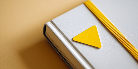 Close-up of a white notebook with a yellow elastic band and a triangular yellow bookmark on a beige surface