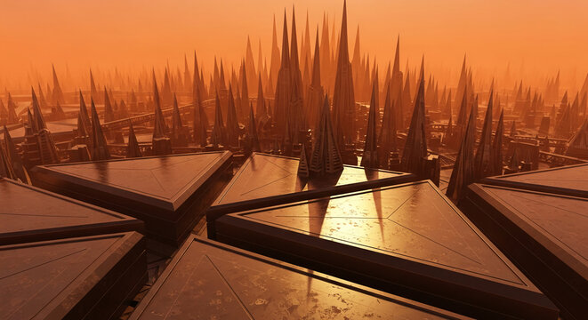 Geometric cityscape featuring triangular platforms and spire-like structures in orange light, representing futuristic architecture and urban planning concept