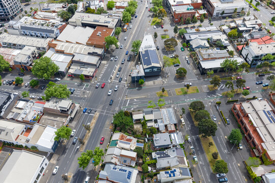 Aerial view of suburban housing on a triangular city block bordered by busy roads